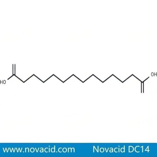 Tetradecanedioic acid (CAS No. 821-38-5), also known as 1,12-Dodecanedicarboxylic acid, 1,14-tetradecanedioic acid or DC14, is an organic dicarboxylic acid with the chemical formula C14H26O4. Produced via an advanced bio-fermentation process exclusively by NOVACID. It is characterized by the fact that it has a straight carbon chain with two terminal carboxylic acid functional groups (-COOH).