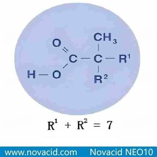 This branched structure also influences the acid's behavior in reactions. Its behavior is similar to that of trialkyl acetic acids, a class known for their steric hindrance related to its branched alkyl groups. This steric hindrance might affect reaction rates and selectivity in certain chemical processes, making NDA suitable for specific synthetic pathways where precise control is necessary. (R1 and R2 are alkyl groups. Novacid NEO10 contains a total of 10 Carbon atoms. Novacid NEO10 is a water-like clear product hat is liquid at ambient temperature.)