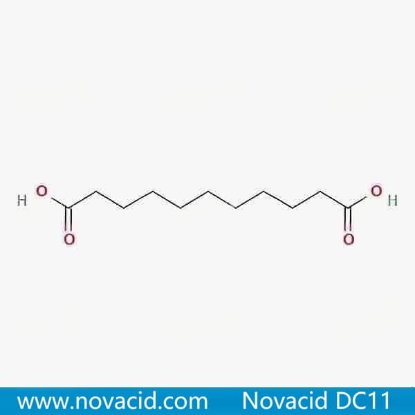 Undecanedioic acid (CAS No. 1852-04-6), also named 1,11-Undecanedioic acid, 1,9-Nonanedicarboxylic acid, UDDA or DC11, is a straight-chain aliphatic dicarboxylic acid with the chemical formula C11H20O4. Produced via an advanced bio-fermentation process exclusively by NOVACID, We can supply you both white powder or white flake. It is a white crystalline powder or flake with good thermal stability and chemical reactivity. As a key intermediate of fine chemicals, it is widely used in the production of high-performance polymers, specialty lubricants and pharmaceutical raw materials.