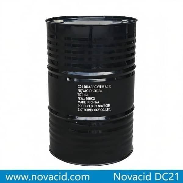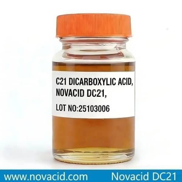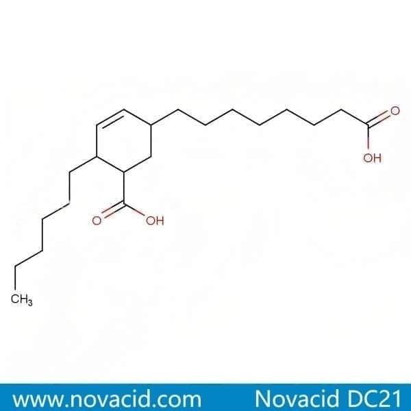 C21 dicarboxylic acid (CAS No. 53980-88-4), also called 5(or 6)-Carboxy-4-hexyl-2- cyclohexene-octanoic acid or 2,2-dimethylpropionyl bromide, containing about 10% oleic- and other fatty acid which is a multifaceted dicarboxylic acid (diacid) ideal for co-emulsification, corrosion inhibition, lubrication and wetting in soluble, semisynthetic and synthetic oils. it can be the equivalent to DIACID 1550. Made from sustainable materials and renewable resources, NOVACID DC21 is resistant to bioactivity, yet still biodegradable. NOVACID DC21 has been known globally in the metalworking fluid (MWF) industry as an excellent co-emulsifier in soluble oil and in semisynthetic metalworking formulations. Novacid DC21 can be replacement of DIACID 1550.